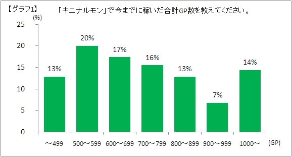 そこで、キニナルモンのポイント取得・交換について聞いてみました。「『キニナルモン』で今までに稼いだ合計GP数を教えてください。」と自由回答で聞いたところ、500~599GPが最も多く20%、続いて600~699GPが17%でした。また、1,000GP以上取得している人が14%を占め、中には15,126GP稼いだ人もいました。【グラフ1】